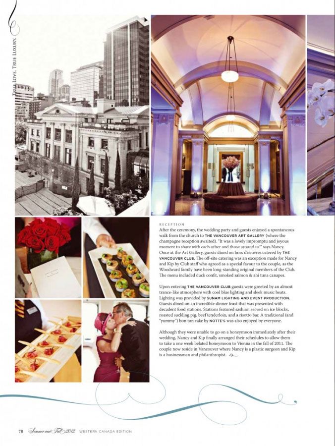 If you want to know about a glamorous wedding read about Nancy & Kip. We were honoured to work on this gorgeous Vancouver wedding at the Christ Cathedral Church, and cocktail hour and reception at the Vancouver Art Gallery & the Vancouver club, respectively. Nancy was straight off the runway in her couture Oscar De La Renta gown and Lanvin heels. It was a night to remember for her and Kip, but Nancy was a bride we will never forget!